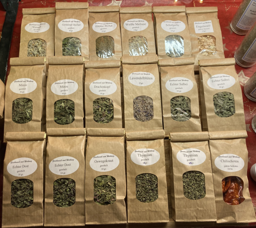 Angebot: Andorn, Anis-Ysop, Gemeiner Beifuß, Einj. Beifuß, Eberraute, Eibisch, Engelwurz (Samen), Echter Dost, Estragon, Gundermann, Heilziest, Johanniskraut (Blüte), Königskerze (Blüte), Lavendel (Blüte), Mariendistel (Blatt, Samen), Mauretanische Malve (Blüte), Melisse, Minze, Odermennige, Oregano, Oswegokraut, Rainfarn, Ringelblume (Blüte), Rosmarin, Salbei, Schafgarbe, Thymian, Weinraute, Weiße Melisse, Wermut, Ysop. Auch spezielle Kräutermischungen für Magen, Erkältung, Nerven oder zum Räuchern, sind auf Anfrage möglich.