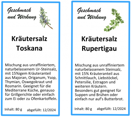 Das Rupertigau Salz beinhaltet verschiedene Suppenkräuter und ist deshalb eher zum würzen von Gemüsebrühen und Suppen geeignet. Dem Toskana Salz sind mehrere aromatische Mittelmeerkräuter beigemischt. Geeignet zum würzen von Gemüse, Fleisch (Steaksalz!), Fisch, Eintöpfe, Aufläufe, aber auch für Marinaden und Würzöle verwendbar.