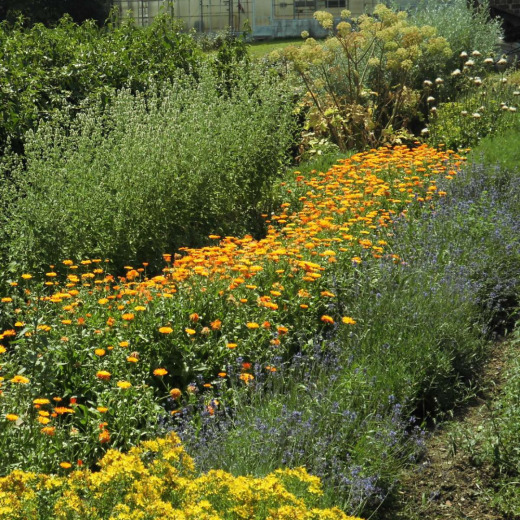 Kräuter: Beifuß, Eberraute, Eisenkraut, Gundermann, Salbei, Johanniskraut, Schafgarbe, Wermut, Lavendel, Melisse, Ysop, Ringelblume