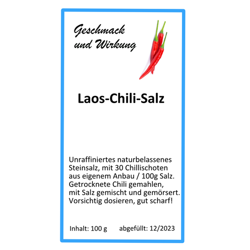 Bestandteile: Basis stellt unraffinierte Steinsalz dar, dem laotische Chili aus eigenem Anbau beigemischt sind.